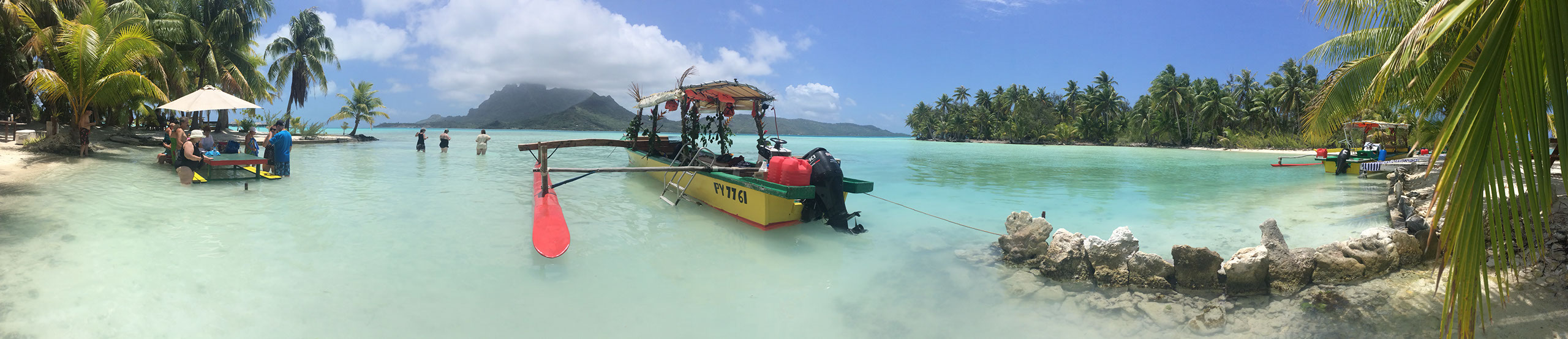 Got up ready for a fifth day of snorkeling. Vaiatiare of Maohi Nui recently moved to Bora Bora from San Bernardino to help out her dad. A colorfully decorated boat took us out to the first stop to swim with Lemon and Black Tip sharks. After 5 minutes the current took us so far out, one of the boat captains was yelling to come back in. I started back but barely made any progress against the current. I started to struggle and worried about being able to get to the boat. I finally made it to one boat but was so exhausted I had to be pulled to my boat 30 yards away. Luckily I wasn't the only one since Karen and at least 2 others needed help. For some reason, fighting the current made me seasick. Next stop was only 5 feet deep where we swam with sting rays and more sharks. Third stop was in 20 feet of water to see reef fish and I wasn't going to chance floating to Papeete again. Finally we travelled to a private motu, a coral island, to meet Patrick the owner and Vai’s father. In a shallow lagoon, looking at Otemanu, the highest peak on the island, pretty much perfect spot. Lunch of Kalua pig, chicken lau lau, poisson cru, grilled tuna and mahi, plantains, and banana poi really hit the spot. Patrick concluded the day with a Tahitian fire dance. Throughout the day, the boat captain sang and played the ukulele while Vai did the hula. Overall a very good excursion except for almost floating away.